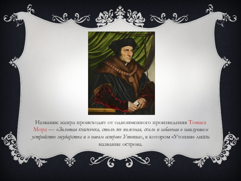 Слайд 3Название жанра происходит от одноименного произведения Томаса Мора — «Золотая книжечка, столь же