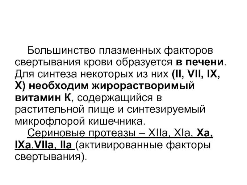 Большинство плазменных факторов свертывания крови образуется в печени. Для синтеза некоторых из них (II, VII, IX, X) необходим жирорастворимый витамин К, содержащийся в растительной пище и синтезируемый микрофлорой кишечника.