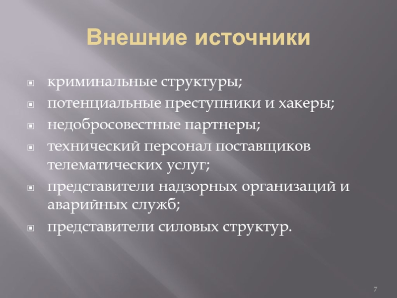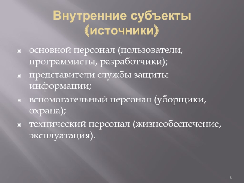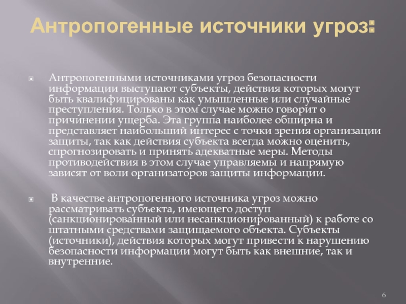 В качестве антропогенного источника угроз можно рассматривать субъекта, имеющего доступ (санкционированный или несанкционированный) к работе со штатными средствами защищаемого объекта. Субъекты (источники), действия которых могут привести к нарушению безопасности информации могут быть как внешние, так и внутренние.
