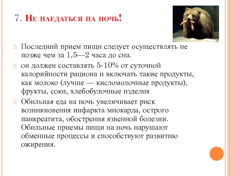 Обильная еда на ночь увеличивает риск возникновения инфаркта миокарда, острого панкреатита, обострения язвенной болезни. Обильные приемы пищи на ночь нарушают обменные процессы и способствуют развитию ожирения.