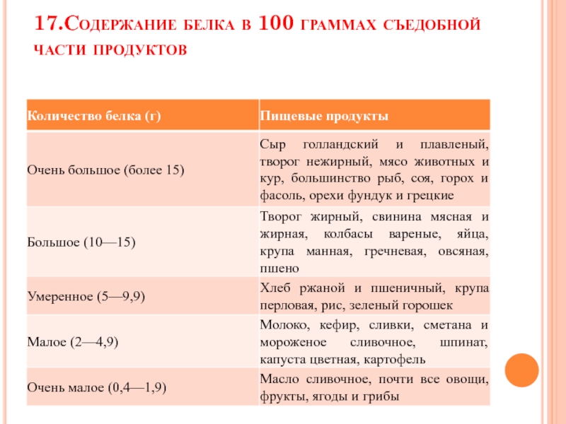 Слайд 1717.Содержание белка в 100 граммах съедобной части продуктов