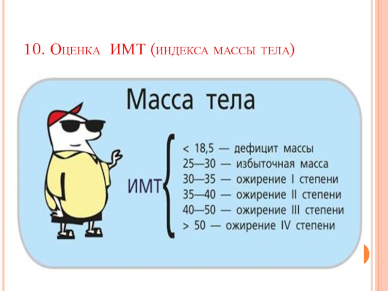 Слайд 1010. Оценка ИМТ (индекса массы тела)