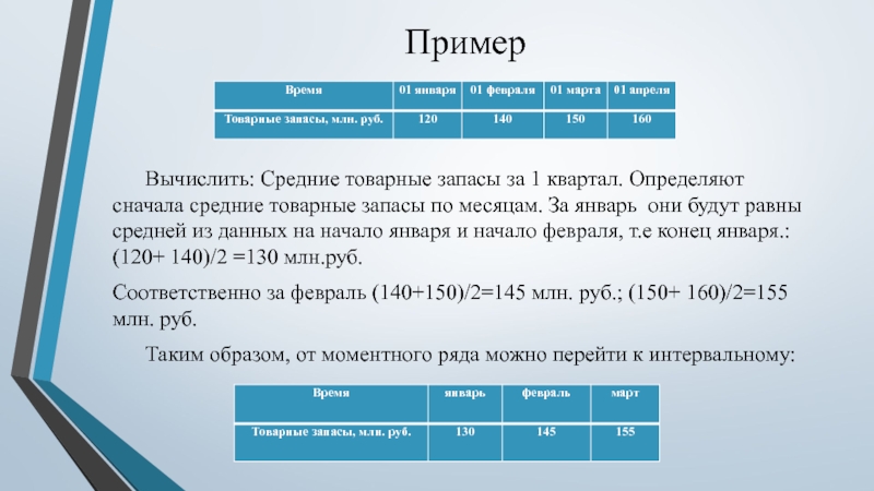 ПРИМЕР: Рассмотрим моментный динамический ряд. Товарные запасы в торговом предприятии на начало каждого месяца характеризуются следующими данными.