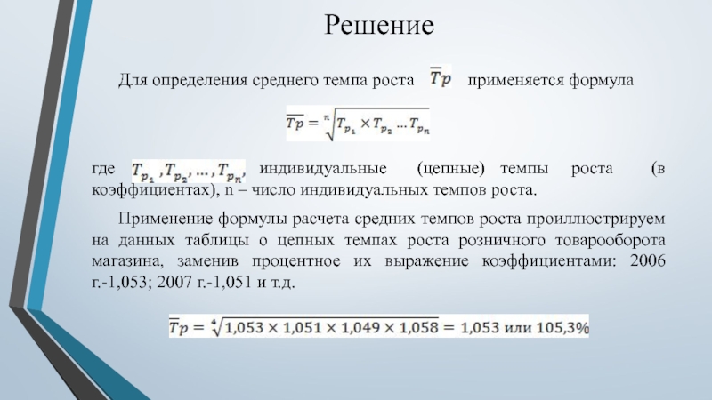 Применение формулы расчета средних темпов роста проиллюстрируем на данных таблицы о цепных темпах роста розничного товарооборота магазина, заменив процентное их выражение коэффициентами: 2006 г.-1,053; 2007 г.-1,051 и т.д.
