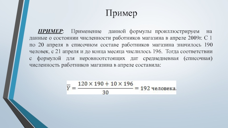 в списочном составе работников магазина значилось 190 человек, с 21 апреля и до конца месяца числилось 196. Тогда соответствии с формулой для неровноотстоящих дат среднедневная (списочная) численность работников магазина в апреле составила: