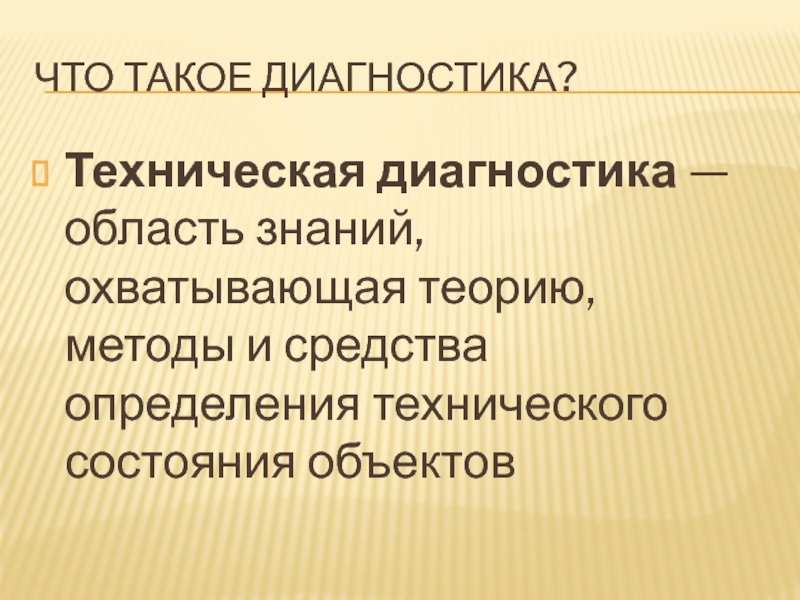ЧТО ТАКОЕ ДИАГНОСТИКА?Техническая диагностика — область знаний, охватывающая теорию, методы и средства определения технического состояния объектов