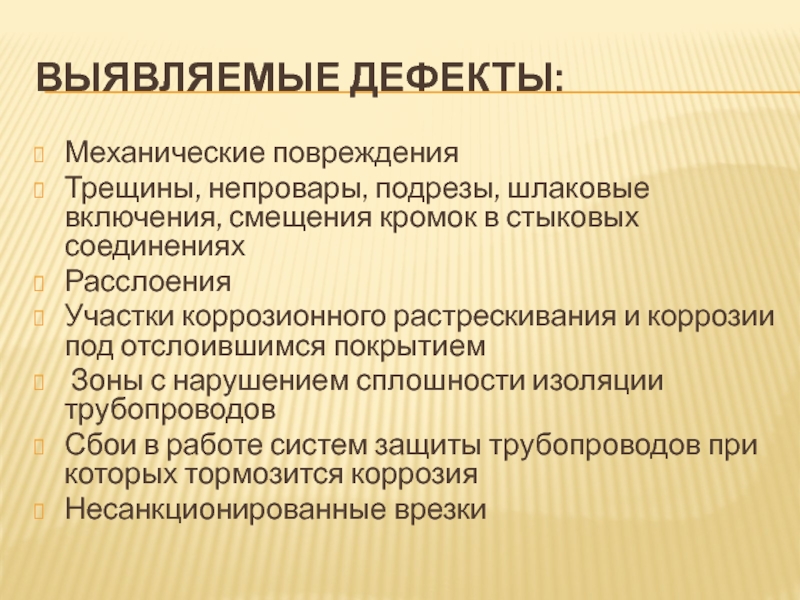 ВЫЯВЛЯЕМЫЕ ДЕФЕКТЫ:Механические поврежденияТрещины, непровары, подрезы, шлаковые включения, смещения кромок в стыковых соединенияхРасслоенияУчастки коррозионного растрескивания и коррозии под