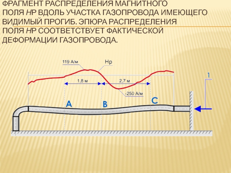 Слайд 12ФРАГМЕНТ РАСПРЕДЕЛЕНИЯ МАГНИТНОГО ПОЛЯ НР ВДОЛЬ УЧАСТКА ГАЗОПРОВОДА ИМЕЮЩЕГО ВИДИМЫЙ ПРОГИБ. ЭПЮРА