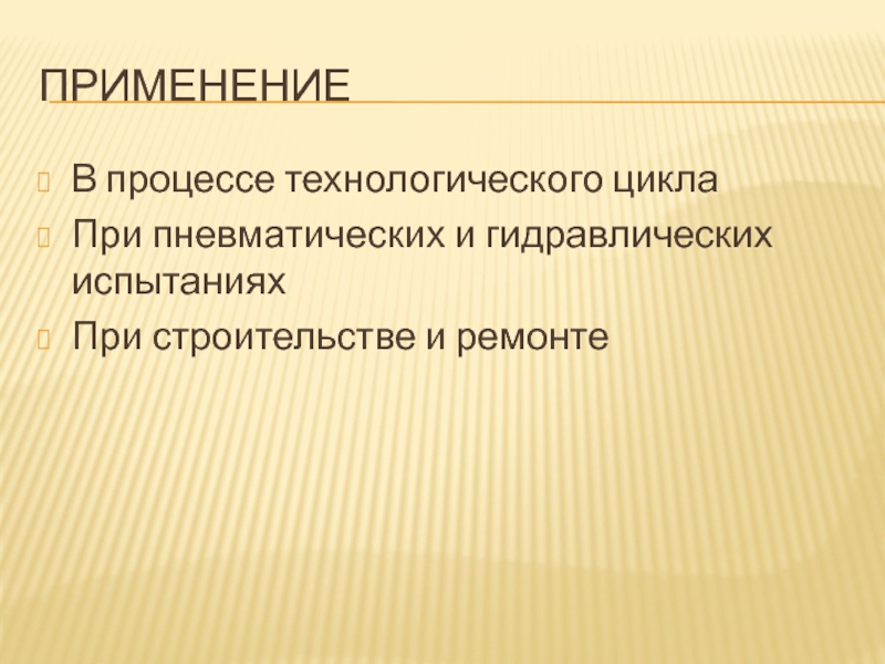ПРИМЕНЕНИЕВ процессе технологического циклаПри пневматических и гидравлических испытанияхПри строительстве и ремонте
