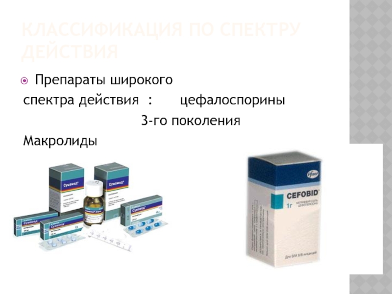 КЛАССИФИКАЦИЯ ПО СПЕКТРУ ДЕЙСТВИЯ Препараты широкого спектра действия :		цефалоспорины 						3-го поколения Макролиды