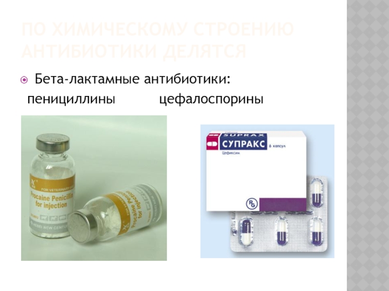 ПО ХИМИЧЕСКОМУ СТРОЕНИЮ АНТИБИОТИКИ ДЕЛЯТСЯ Бета-лактамные антибиотики: пенициллины			цефалоспорины