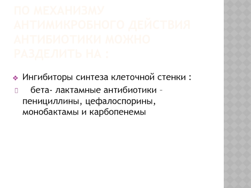ПО МЕХАНИЗМУ АНТИМИКРОБНОГО ДЕЙСТВИЯ АНТИБИОТИКИ МОЖНО РАЗДЕЛИТЬ НА : Ингибиторы синтеза клеточной стенки :