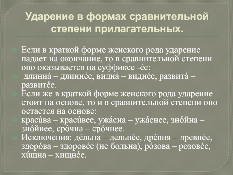 Исключения: дéльна – дельнéе, дрéвня – древнéе, здорóва – здоровéе (не больна), рóзова – розовéе, хúщна – хищнéе.