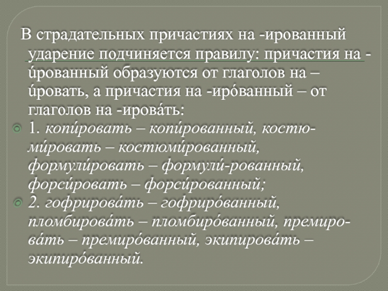 1. копúровать – копúрованный, костю-мúровать – костюмúрованный, формулúровать – формулú-рованный, форсúровать – форсúрованный;