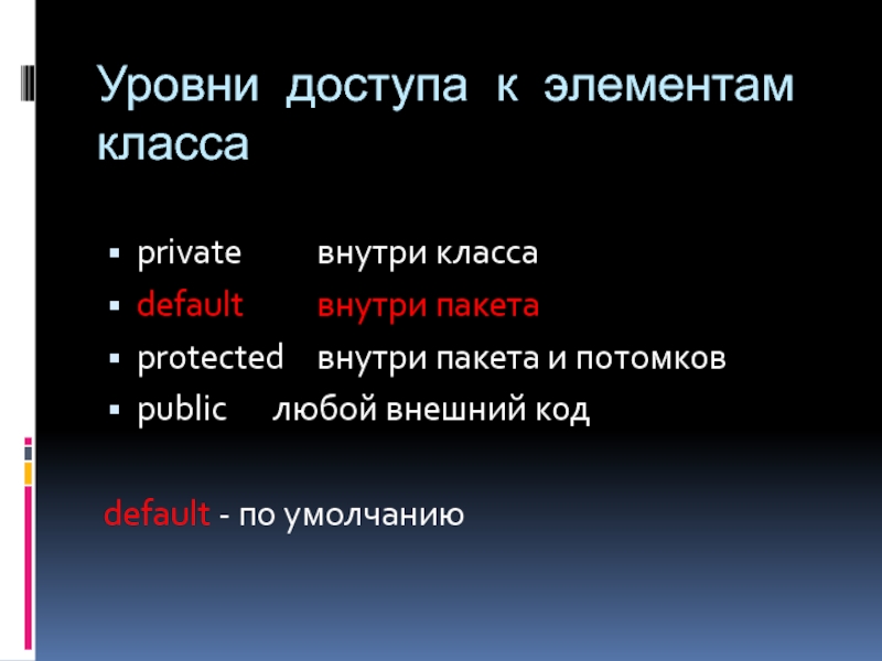 Слайд 18Уровни доступа к элементам класса