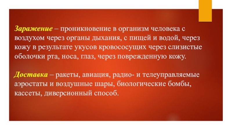 Слайд 4Заражение – проникновение в организм человека с воздухом через органы