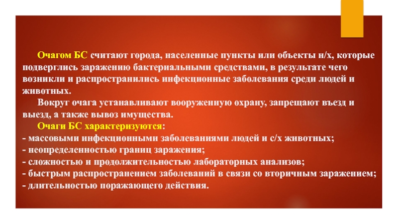 Слайд 7 Очагом БС считают города, населенные пункты или объекты н/х, которые