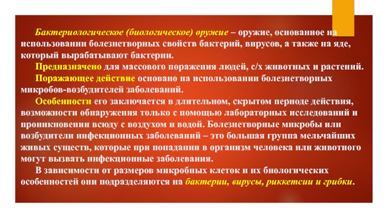 Слайд 2 Бактериологическое (биологическое) оружие – оружие, основанное на использовании болезнетворных свойств