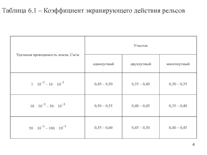 Слайд 4Таблица 6.1 – Коэффициент экранирующего действия рельсов