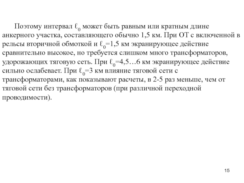 рельсы вторичной обмоткой и ℓ0=1,5 км экранирующее действие сравнительно высокое, но требуется слишком много трансформаторов, удорожающих тяговую сеть. При ℓ0=4,5…6 км экранирующее действие сильно ослабевает. При ℓ0=3 км влияние тяговой сети с трансформаторами, как показывают расчеты, в 2-5 раз меньше, чем от тяговой сети без трансформаторов (при различной переходной проводимости).