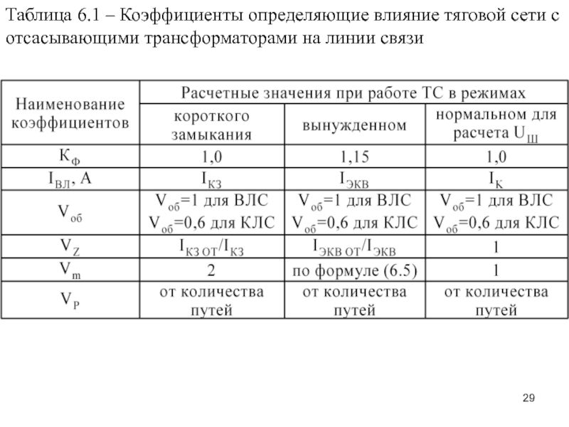 Слайд 29Таблица 6.1 – Коэффициенты определяющие влияние тяговой сети с отсасывающими