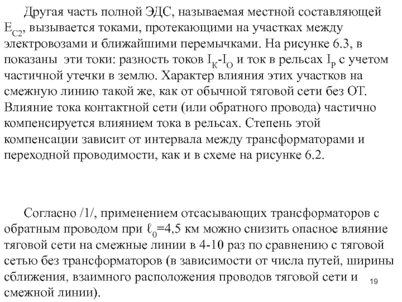 При наличии отсасывающих трансформаторов ток в рельсах в местах их включения равен току вторичной обмотки IP = IT2 ≈ - IKС. Распределение тока в рельсах для этого случая показано сплошной линией 2 на рисунке 6.2, в. Поскольку ток в рельсах при этом больше, чем без трансформаторов, то и экранирующее действие его проявляется сильнее.