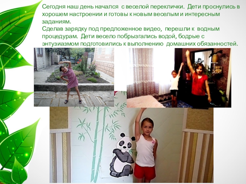 Сделав зарядку под предложенное видео, перешли к водным процедурам. Дети весело побрызгались водой, бодрые с энтузиазмом подготовились к выполнению домашних обязанностей.