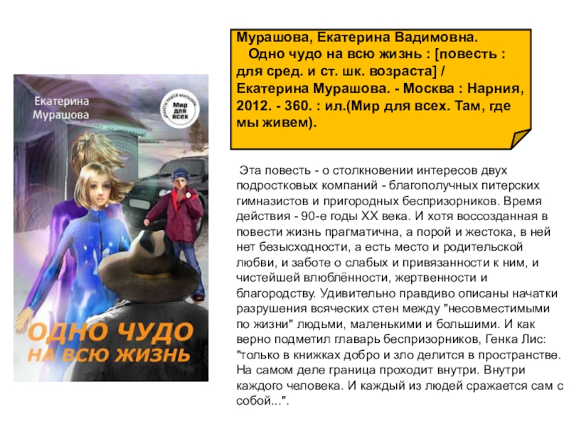 Эта повесть - о столкновении интересов двух подростковых компаний - благополучных питерских гимназистов и пригородных беспризорников. Время действия - 90-е годы XX века. И хотя воссозданная в повести жизнь прагматична, а порой и жестока, в ней нет безысходности, а есть место и родительской любви, и заботе о слабых и привязанности к ним, и чистейшей влюблённости, жертвенности и благородству. Удивительно правдиво описаны начатки разрушения всяческих стен между "несовместимыми по жизни" людьми, маленькими и большими. И как верно подметил главарь беспризорников, Генка Лис: "только в книжках добро и зло делится в пространстве. На самом деле граница проходит внутри. Внутри каждого человека. И каждый из людей сражается сам с собой...".