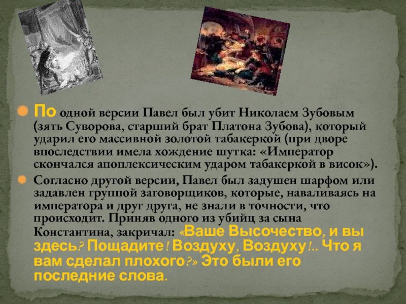 Слайд 8По одной версии Павел был убит Николаем Зубовым (зять Суворова,