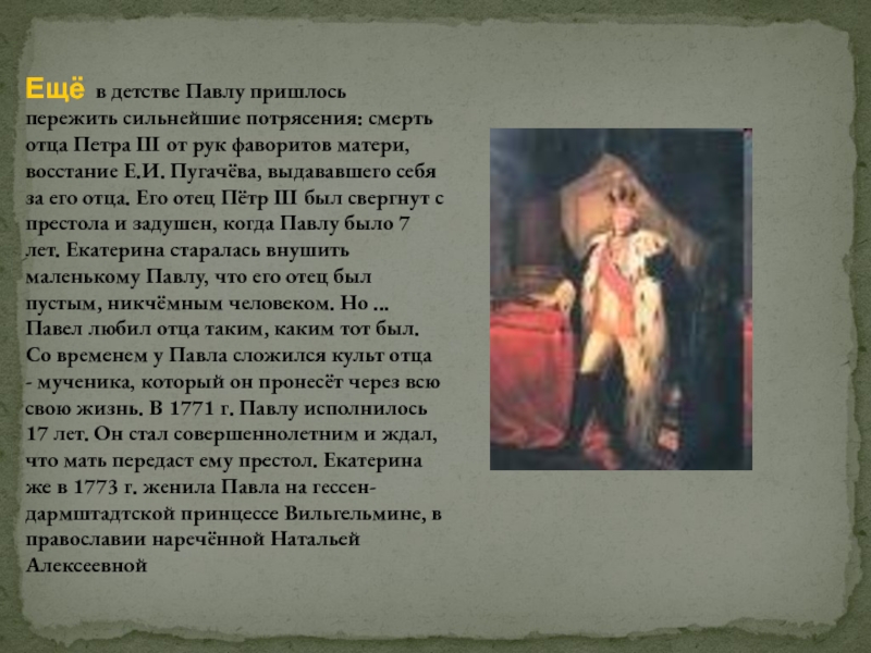 себя за его отца. Его отец Пётр III был свергнут с престола и задушен, когда Павлу было 7 лет. Екатерина старалась внушить маленькому Павлу, что его отец был пустым, никчёмным человеком. Но ...Павел любил отца таким, каким тот был. Со временем у Павла сложился культ отца - мученика, который он пронесёт через всю свою жизнь. В 1771 г. Павлу исполнилось 17 лет. Он стал совершеннолетним и ждал, что мать передаст ему престол. Екатерина же в 1773 г. женила Павла на гессен-дармштадтской принцессе Вильгельмине, в православии наречённой Натальей Алексеевной