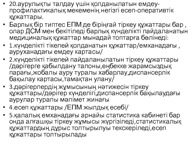 Слайд 220.аурулықты талдау үшін қолданылатын емдеу-профилактикалық мекеменің негізгі есеп-оперативтік құжаттары.