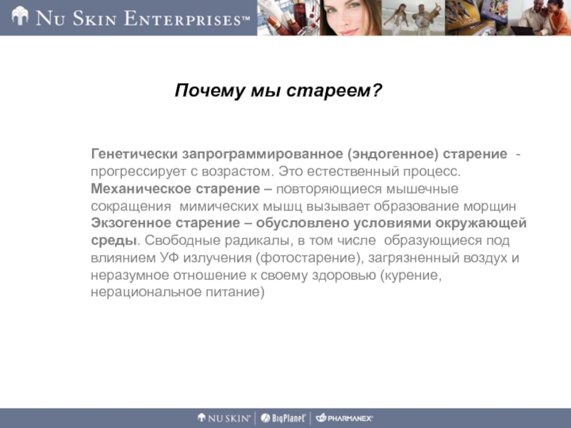 Экзогенное старение – обусловлено условиями окружающей среды. Свободные радикалы, в том числе образующиеся под влиянием УФ излучения (фотостарение), загрязненный воздух и неразумное отношение к своему здоровью (курение, нерациональное питание)