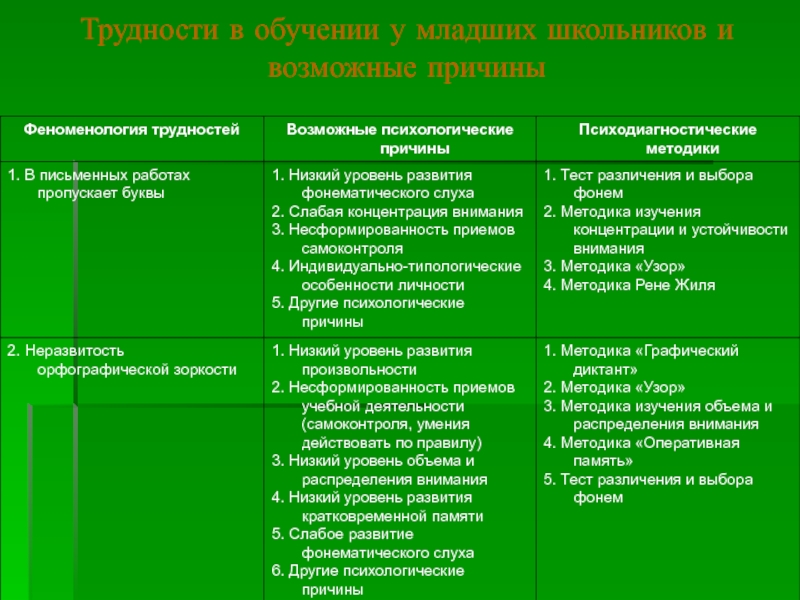 Слайд 33Трудности в обучении у младших школьников и возможные причины