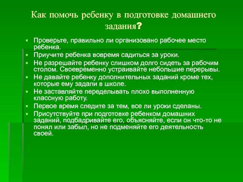 Присутствуйте при подготовке ребенком домашних заданий, подбадривайте его, объясняйте, если он что-то не понял или забыл, но не подменяйте его деятельность своей.