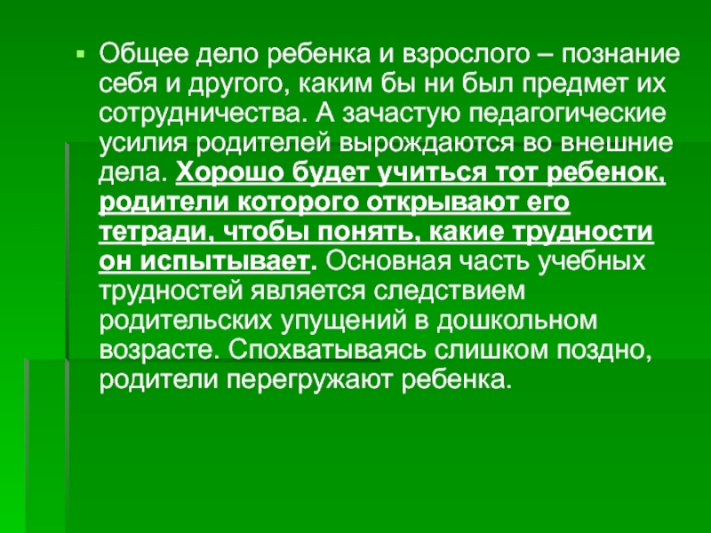 усилия родителей вырождаются во внешние дела. Хорошо будет учиться тот ребенок, родители которого открывают его тетради, чтобы понять, какие трудности он испытывает. Основная часть учебных трудностей является следствием родительских упущений в дошкольном возрасте. Спохватываясь слишком поздно, родители перегружают ребенка.