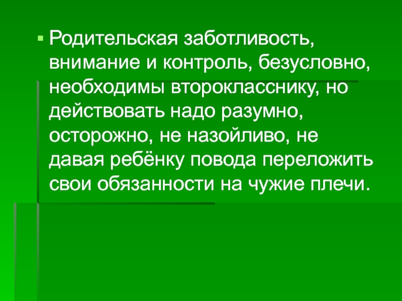 Слайд 8Родительская заботливость, внимание и контроль, безусловно, необходимы второкласснику, но действовать