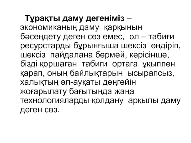 өндіріп, шексіз пайдалана бермей, керісінше, бізді қоршаған табиғи ортаға ұқыппен қарап, оның байлықтарын ысырапсыз, халықтың әл-ауқаты деңгейін жоғарылату бағытында жаңа технологияларды қолдану арқылы даму деген сөз.