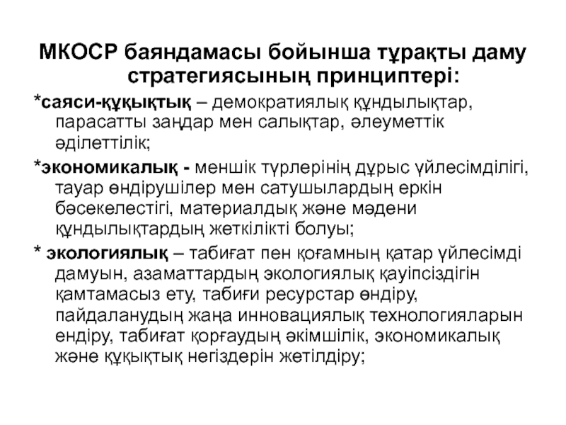 Слайд 6МКОСР баяндамасы бойынша тұрақты даму стратегиясының принциптері: