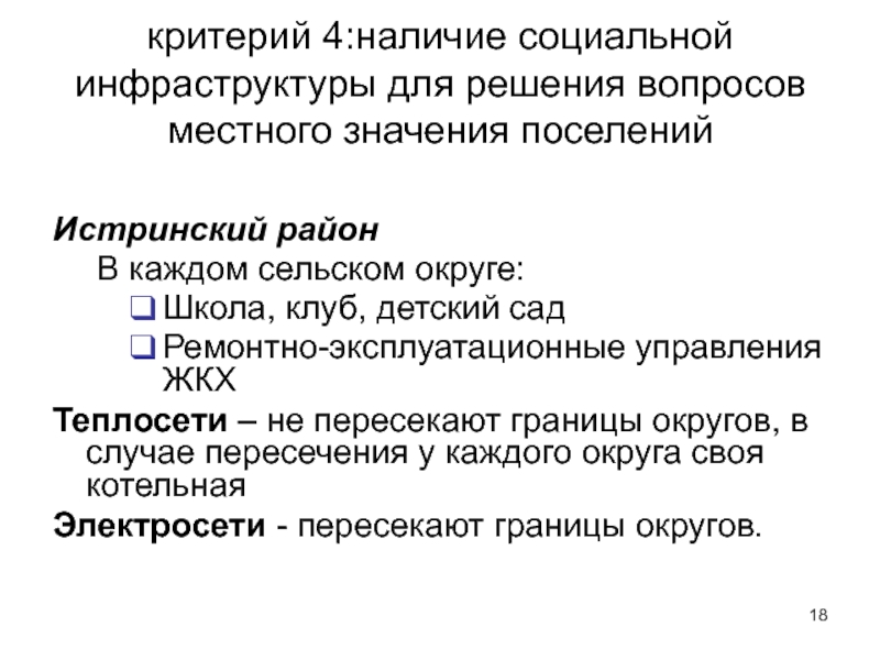 Слайд 18критерий 4:наличие социальной инфраструктуры для решения вопросов местного значения поселений
