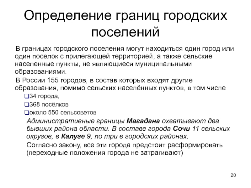 Административные границы Магадана охватывают два бывших района области. В составе города Сочи 11 сельских округов, в Калуге 9, по три в городских районах.