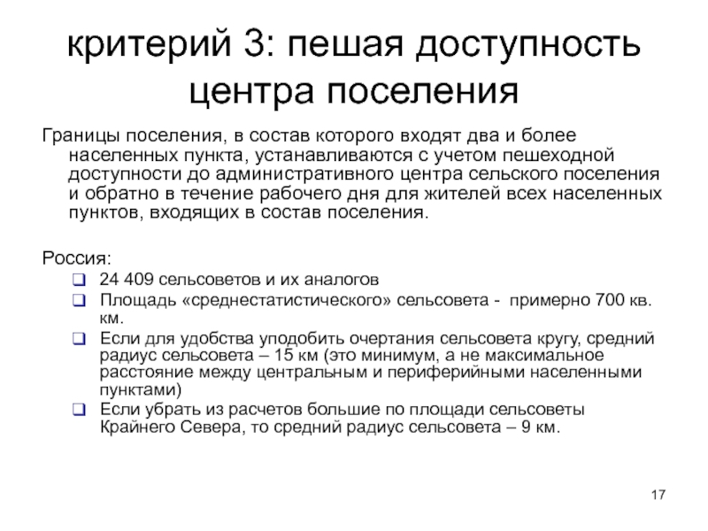 Если убрать из расчетов большие по площади сельсоветы Крайнего Севера, то средний радиус сельсовета – 9 км.
