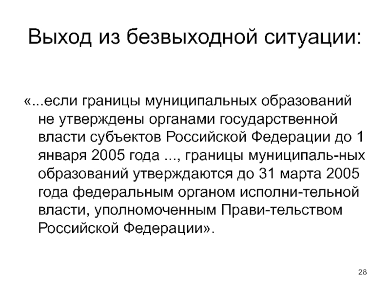 ..., границы муниципаль-ных образований утверждаются до 31 марта 2005 года федеральным органом исполни-тельной власти, уполномоченным Прави-тельством Российской Федерации».