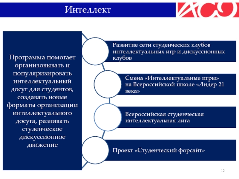 Слайд 12Программа помогает организовывать и популяризировать интеллектуальный досуг для студентов, создавать