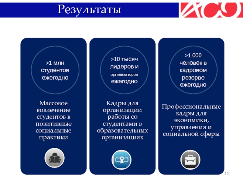>1 млн студентов ежегодно>10 тысяч лидеров и организаторов ежегодно>1 000 человек в кадровом резерве ежегодно