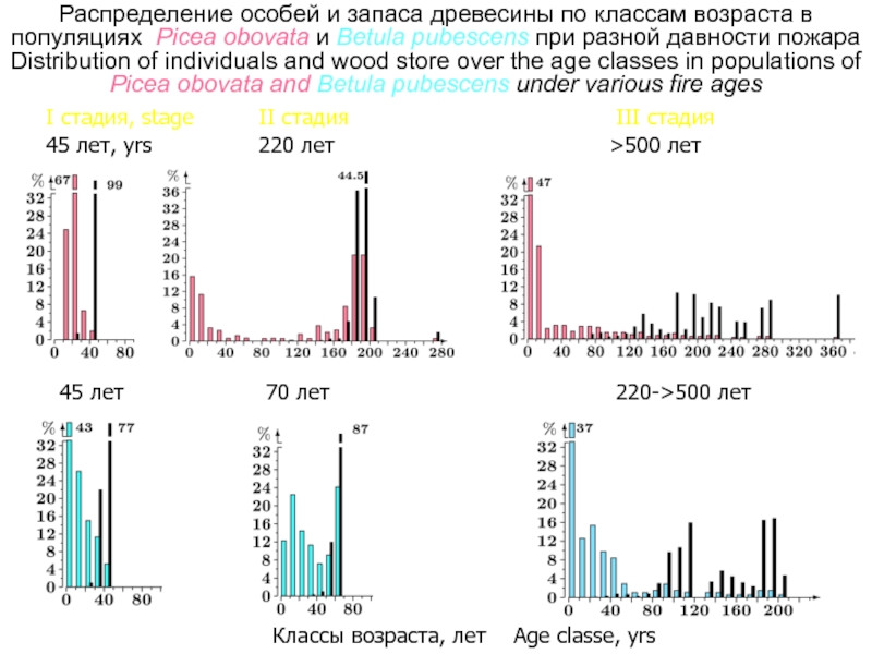 Слайд 118Распределение особей и запаса древесины по классам возраста в популяциях