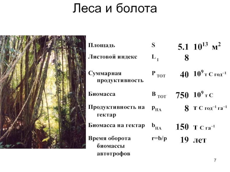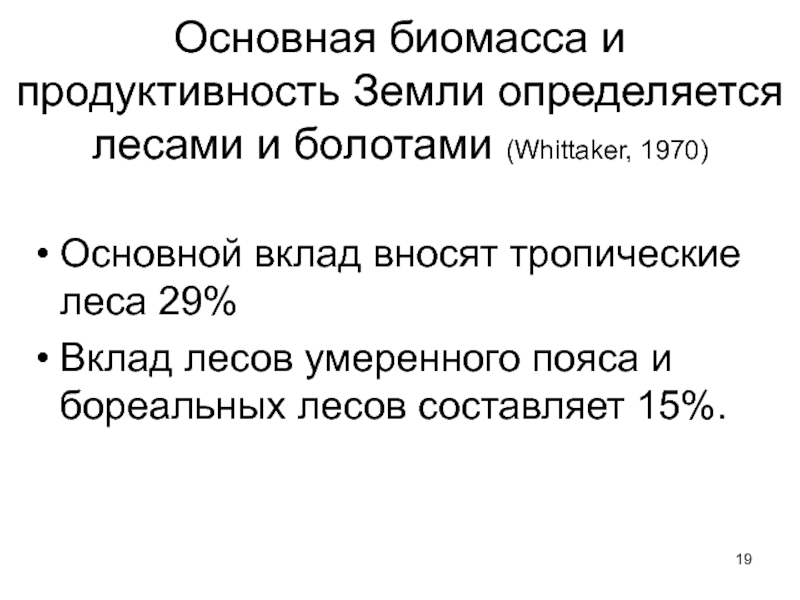 Слайд 19Основная биомасса и продуктивность Земли определяется лесами и болотами (Whittaker,
