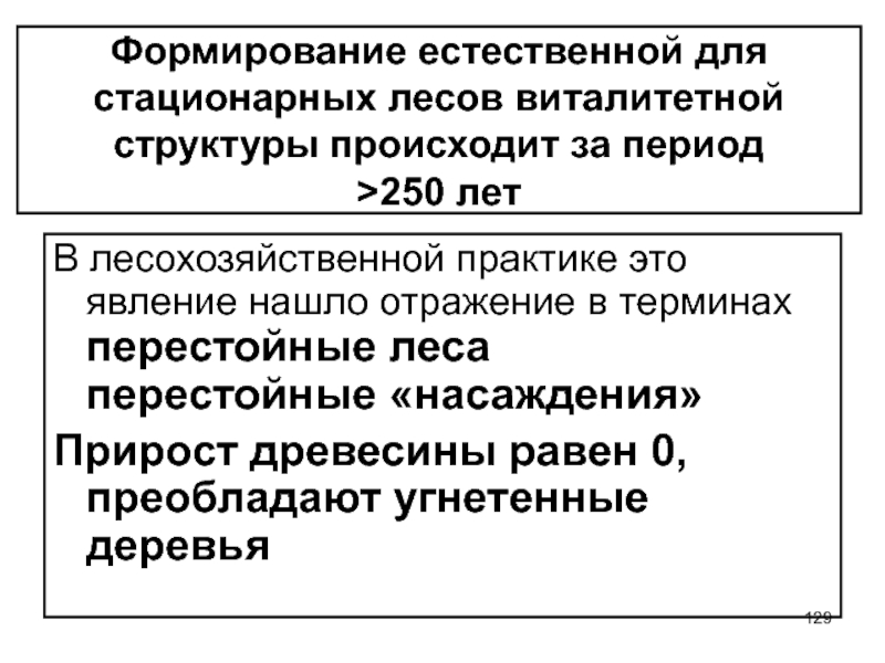 Слайд 129Формирование естественной для стационарных лесов виталитетной структуры происходит за период