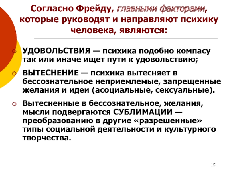 Слайд 15Согласно Фрейду, главными факторами, которые руководят и направляют психику человека,