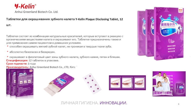 * окрашивает в фиолетовый цвет зоны зубного налета, зубного камня, пятен и бляшек. Спецификация: 12 таблеток в упаковке.