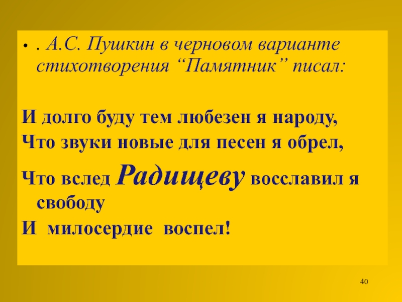 Слайд 40. А.С. Пушкин в черновом варианте стихотворения “Памятник” писал: